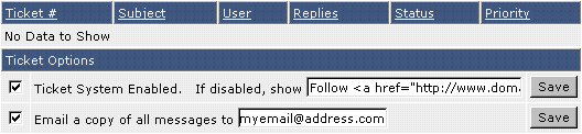 To disable the ticket system, uncheck the box beside "Ticket System Enabled." Your customers will still see the link to the ticket support system in their control panel, so enter a support page (using HTML code) in the provided text box.