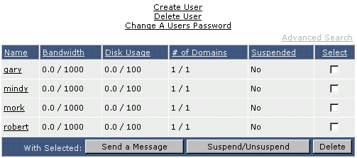 На экране появится список Ваших пользователей. В таблице также содержится информация информация о трафике пользователей, использование дискового пространства, количестве доменов и статус активности пользователя. Вы можете отсортировать список по столбцам нажатием мышки на заголовок столбца. Например, чтобы отсортировать список по использумому трафику нажмите на "Bandwidth" сверху таблицы.