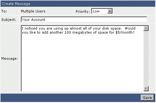Поле "To:" ("Кому") будет содержать "Multiple Users" ("Выбранным пользователям") даже несмотря на то, что Вы выбрали всего одного пользователя из списка. Установите приоритет сообщения, наберите тему сообщения и его текст. Затем нажмите "Save." ("Сохранить")