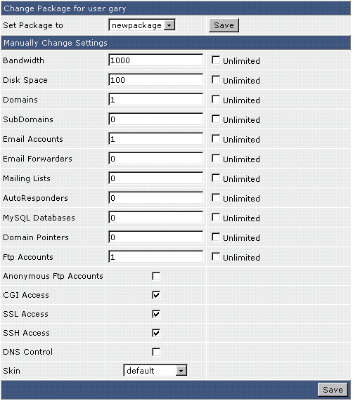 To change the User's package, simply select the desired package name from the dropdown menu and click "Save." Or, you can manually edit the User's settings below. Please note that you cannot change a User's IP address or domain name. Such a change requires that you remove and recreate the User account.