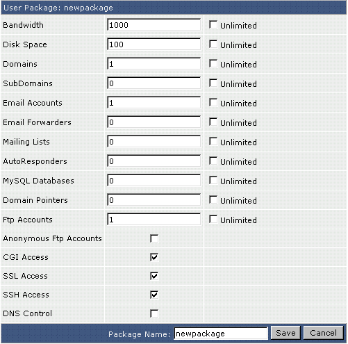 Пользовательский набор - это совокупность параметров хостинга (трафик, используемое место на диске и так далее). Если на Вашем аккаунте еще нет пользовательских наборов, то Вы не сможете создать нового пользователя так как настройки Ваших пользователи обязательно должны содержать ссылки на набор параметров хостинга. Нажмите ссылку "Add Package" ("Добавить набор") сверху экрана.