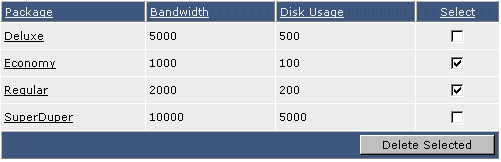To delete one or more packages, place a check next to the package name(s) and click the "Delete Selected" button. In the above example, the Economy and Regular packages would be deleted.
